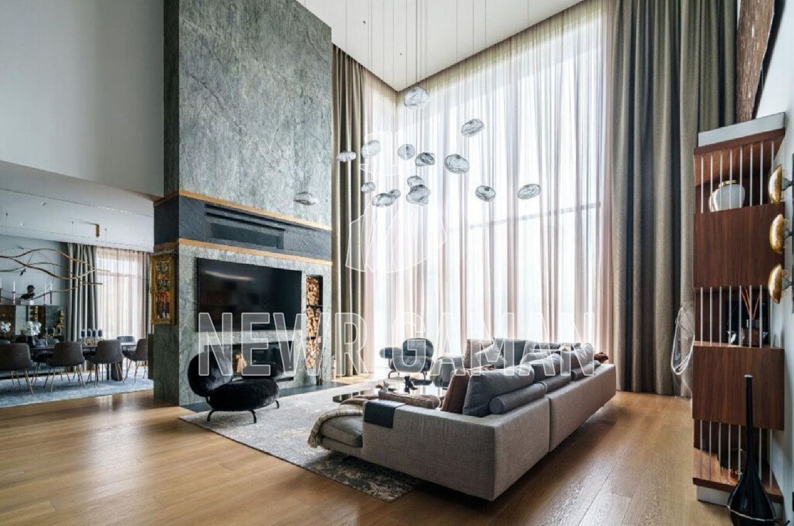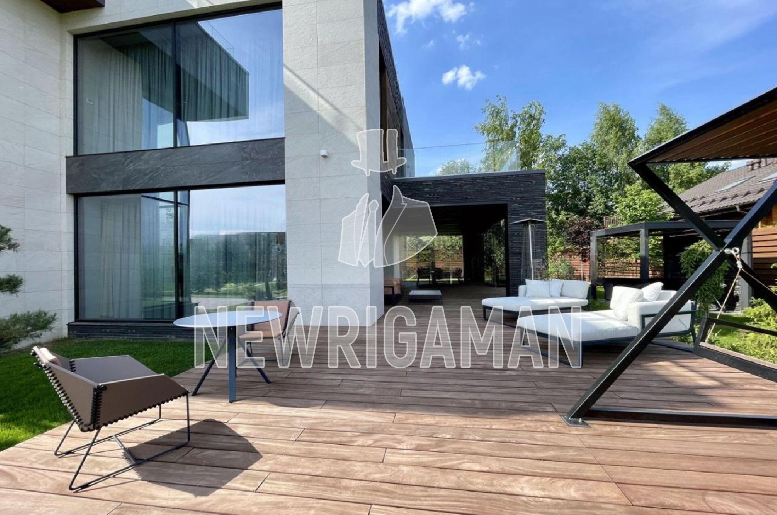 Продажа загородного дома площадью 600 кв. м. Рублёво-Успенское шоссе, 16 км от МКАД. Коттеджный поселок Горки-8. Дом построен в 2 этажа под ключ. Современный проект с панорамным остеклением, двусветной гостиной с камином, просторными помещениями, спа-зоной с бассейном, оборудованными террасами для отдыха и барбекю, а также с эксплуатируемой кровлей. В отделке интерьеров применены отделочные материалы премиального уровня. Дом полностью оснащен мебелью и предметами декора от ведущих мировых брендов: Flexform, Minotti, Molteni&C, Freifrau, De Castelli, Capo Dopera. Дом оборудован самыми современными инженерными системами, включая систему \"умный дом\" с голосовым управлением. Помимо основного дома на участке оборудованы: гостевой дом с гостиной-столовой-кухней и двумя гостевыми спальнями с санузлом, отдельная квартира для персонала, гаражный комплекс для трех авто, с дополнительной крытой парковкой на 2 м/м и гостевой паркинг на 10 м/м. Площадь участка 27 соток.