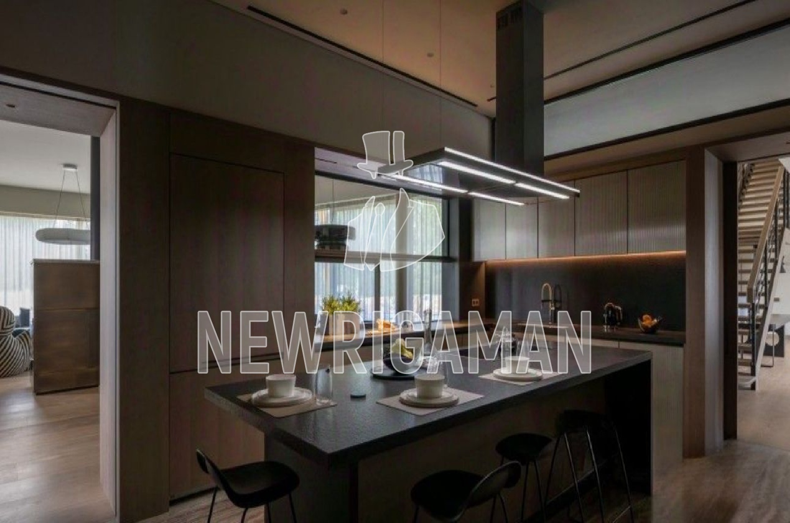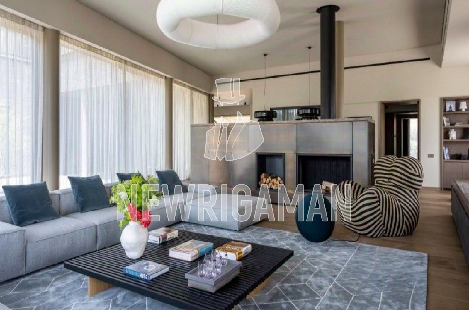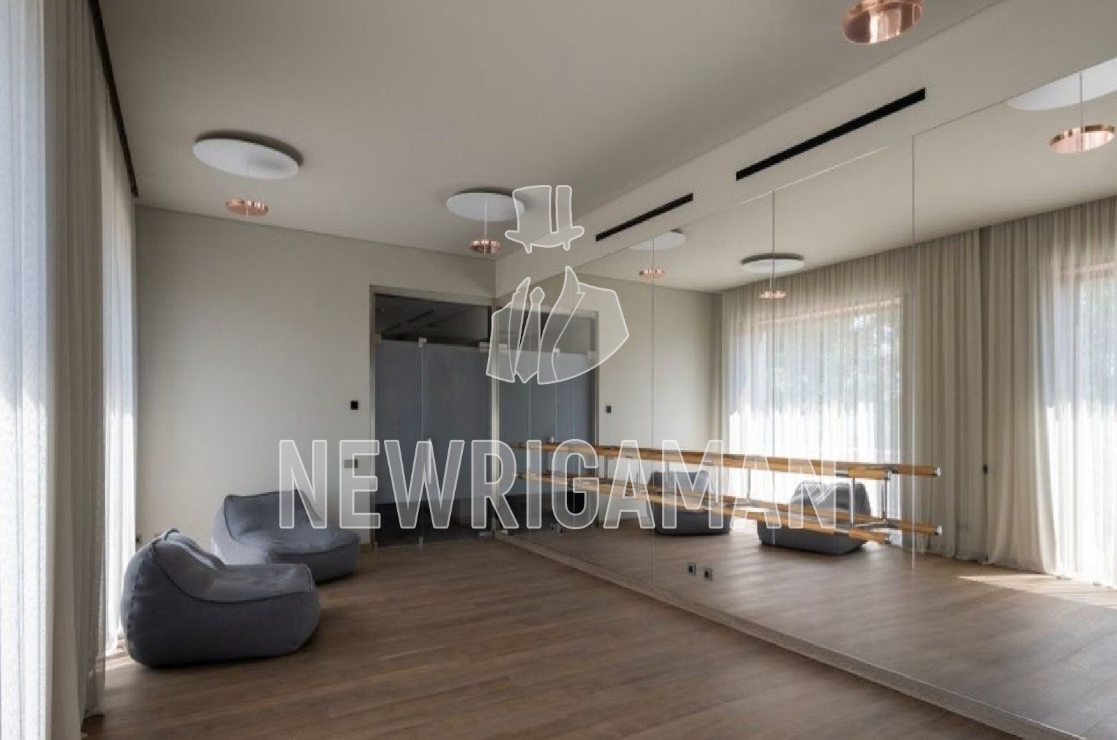 1 этаж -холл, гардеробная, кухня, столовая, гостиная-салон с панорамным остеклением и камином, зона спа: фитнес-зал, массажная, сауна, хамам, с/у, гостевой блок, гараж на 3м/м, блок для персонала, рабочая кухня, кладовая, постирочная,