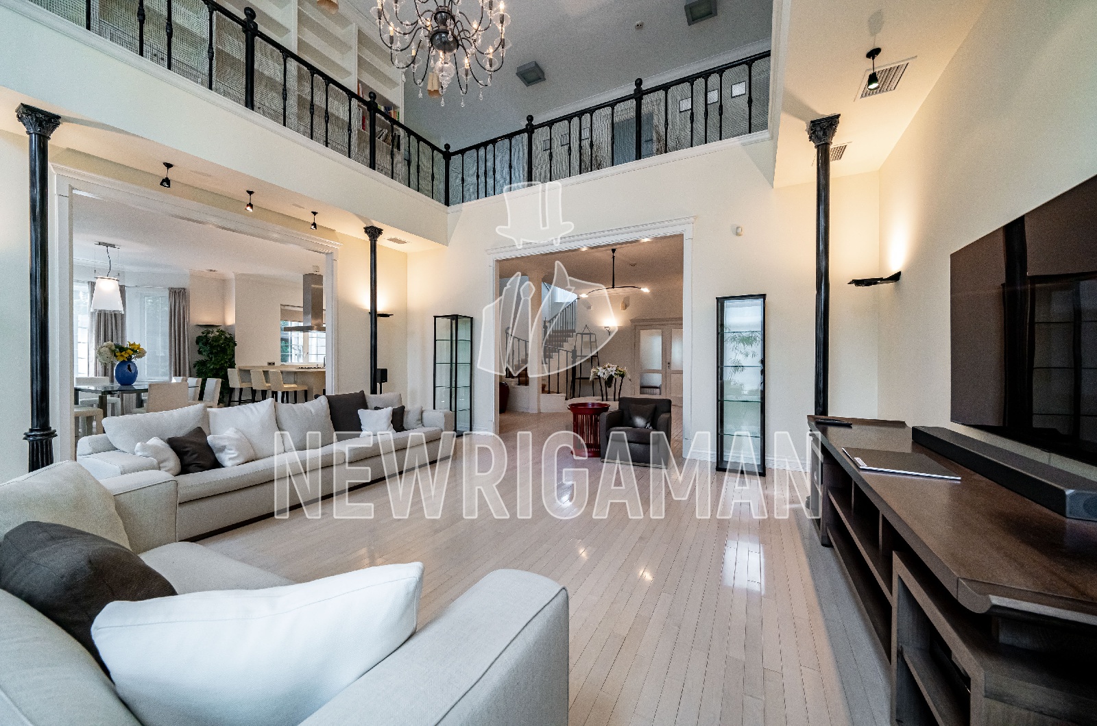 1 этаж - холл, гостиная со вторым светом и камином, кухня-столовая с выходом на террасу, гостевой с/у, гостевая спальня, кабинет/гостевая спальня, постирочная-