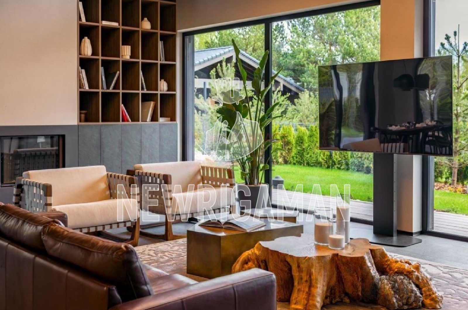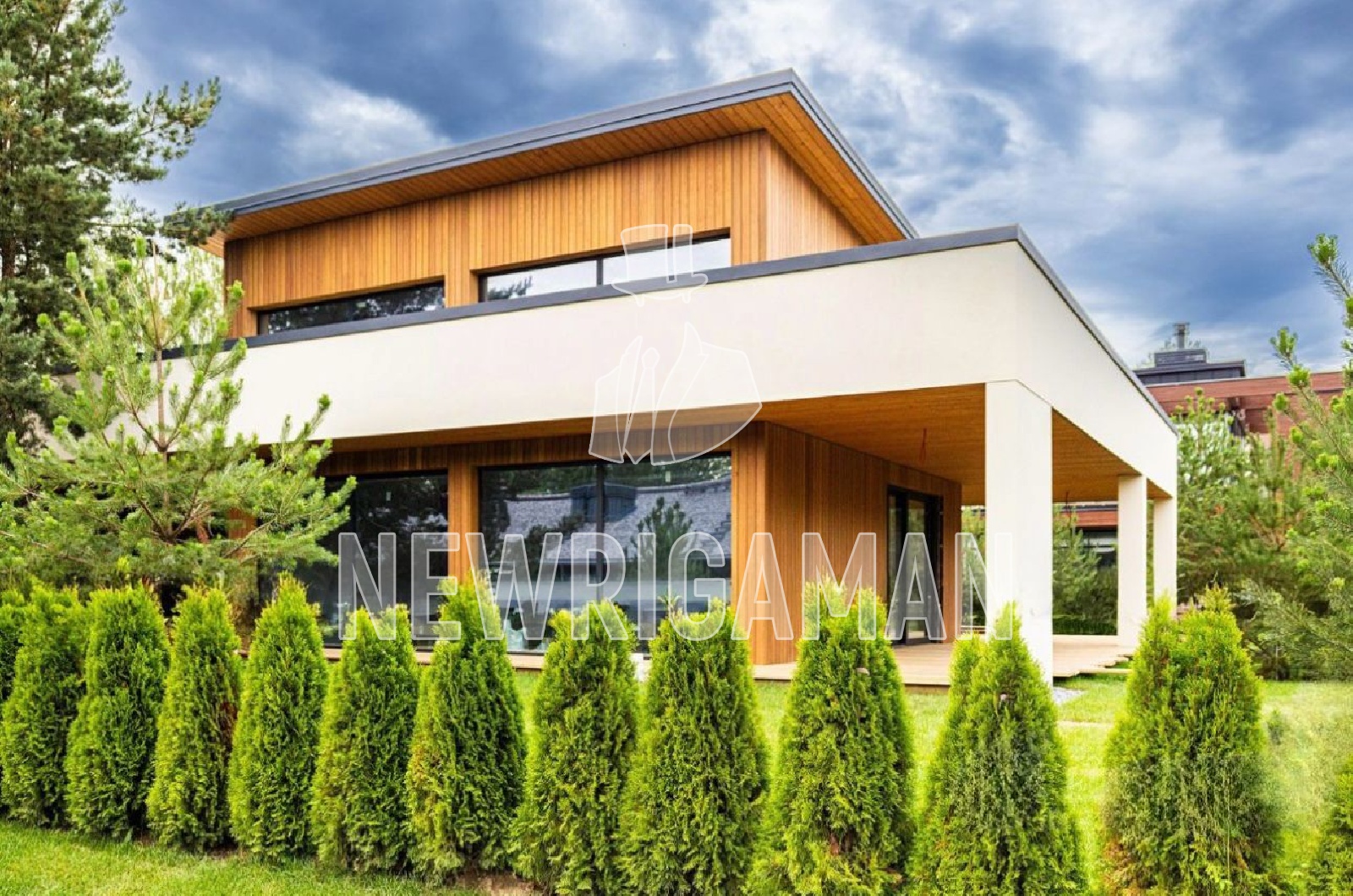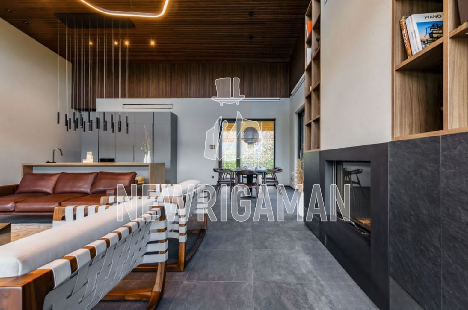 1 этаж - холл, гардеробная, кухня-столовая, гостиная с выходом на террасу, гостевая спальня с ванной комнатой, спальня с ванной и гардеробной, детская спальня с ванной и гардеробной, гостевой с/у, кабинет, душевая, сауна из термообработанной осины, постирочная.