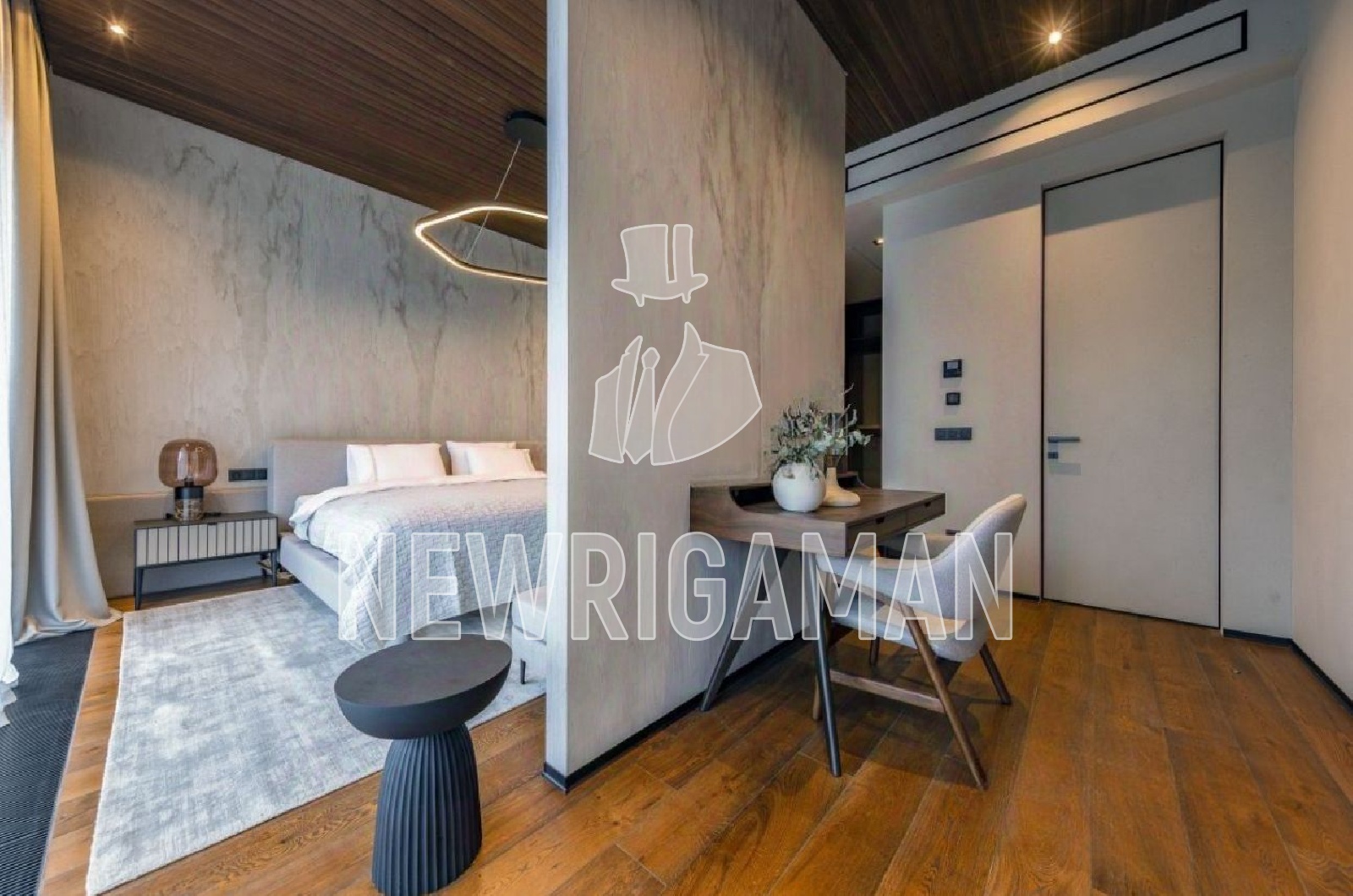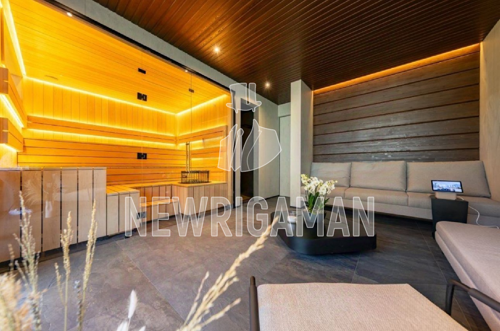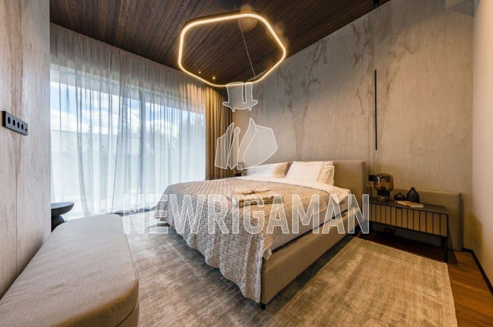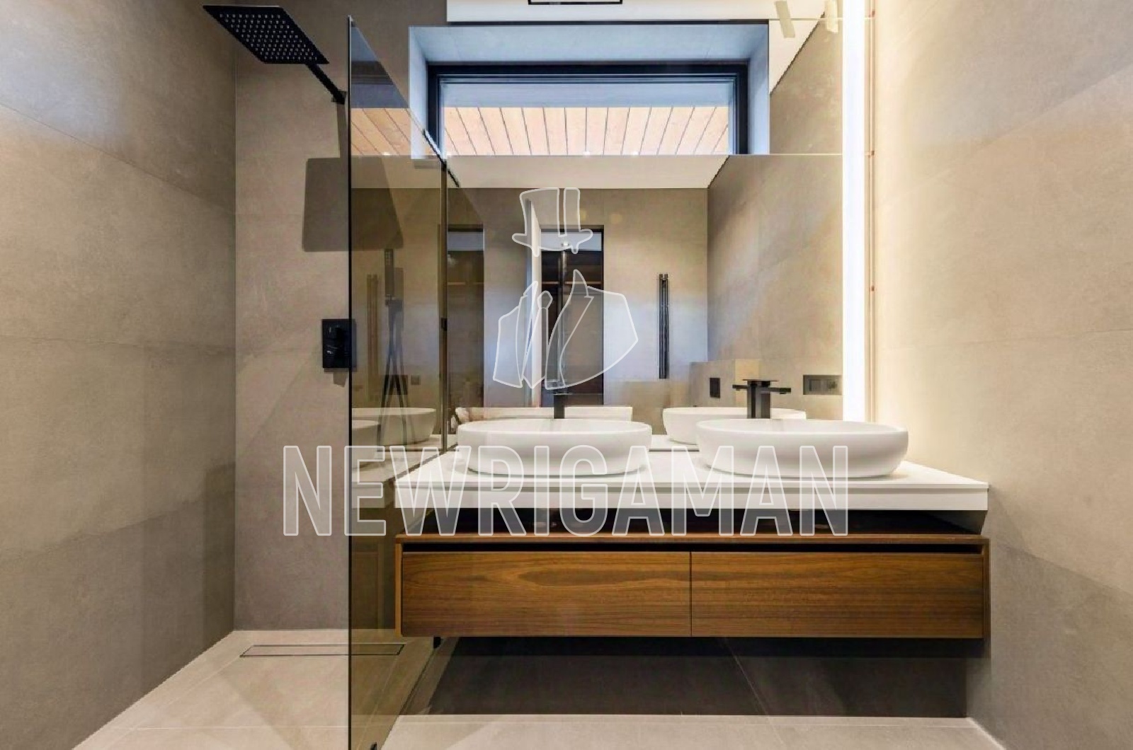 1 этаж - холл, гардеробная, кухня-столовая, гостиная с выходом на террасу, гостевая спальня с ванной комнатой, спальня с ванной и гардеробной, детская спальня с ванной и гардеробной, гостевой с/у, кабинет, душевая, сауна из термообработанной осины, постирочная.