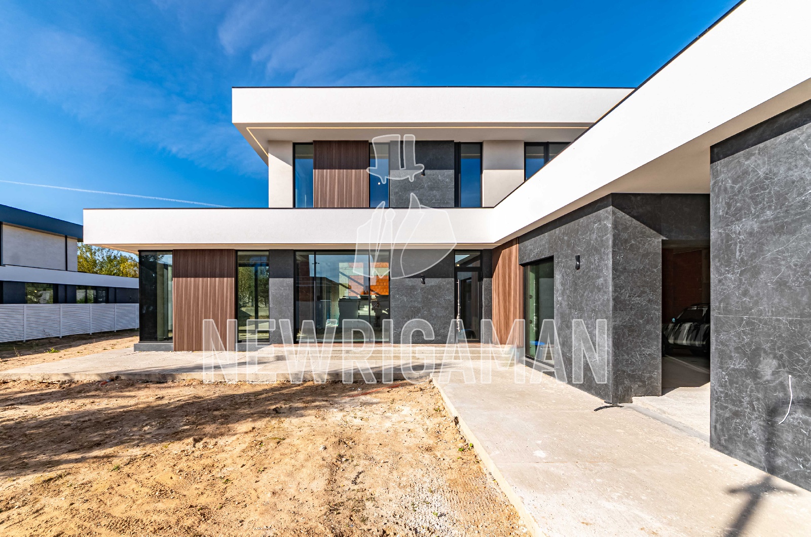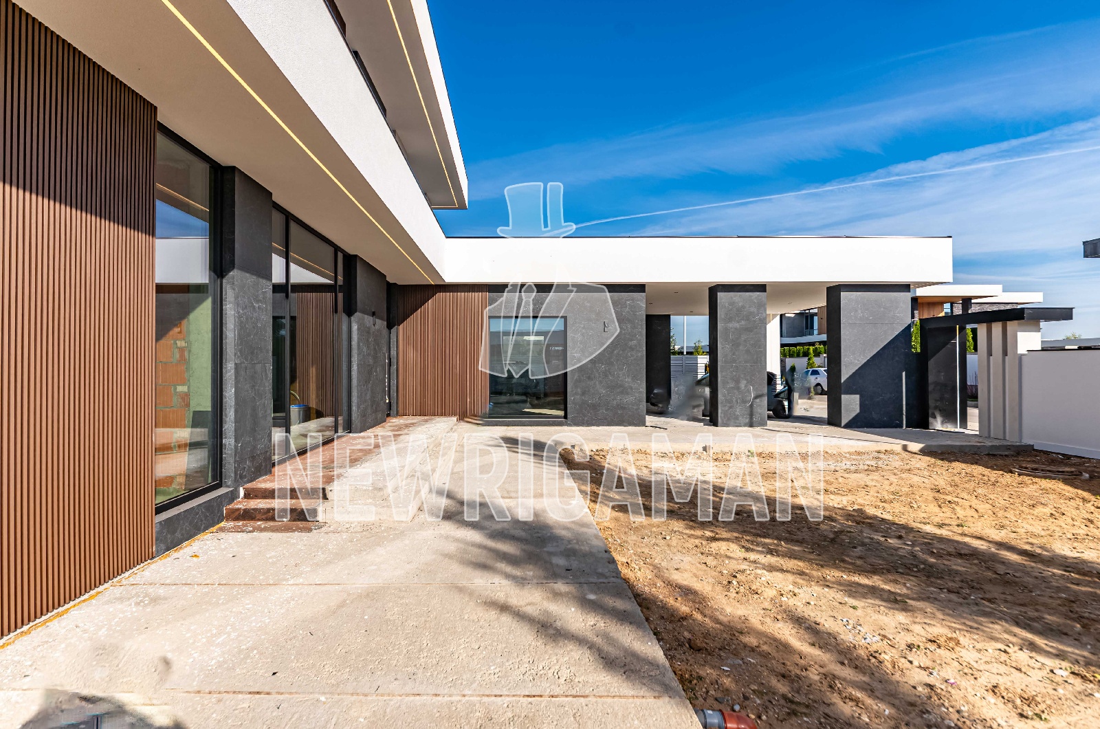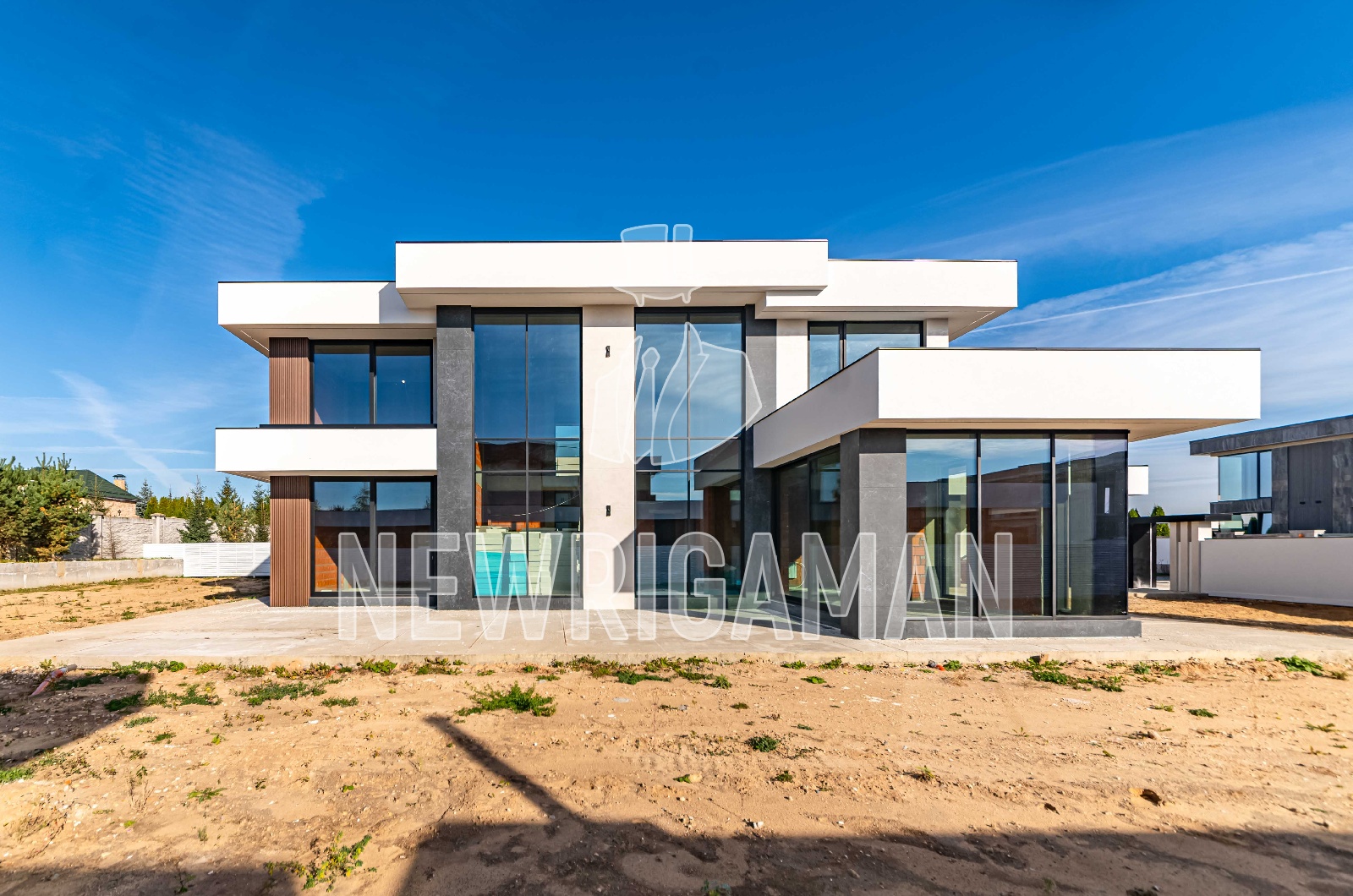1 этаж - топочная, гардероб, кухня, столовая, гостиная, гостевая спальня с с/у и гардеробной, постирочная/комната для персонала, терраса, навес и гараж на 2 м/м каждый,