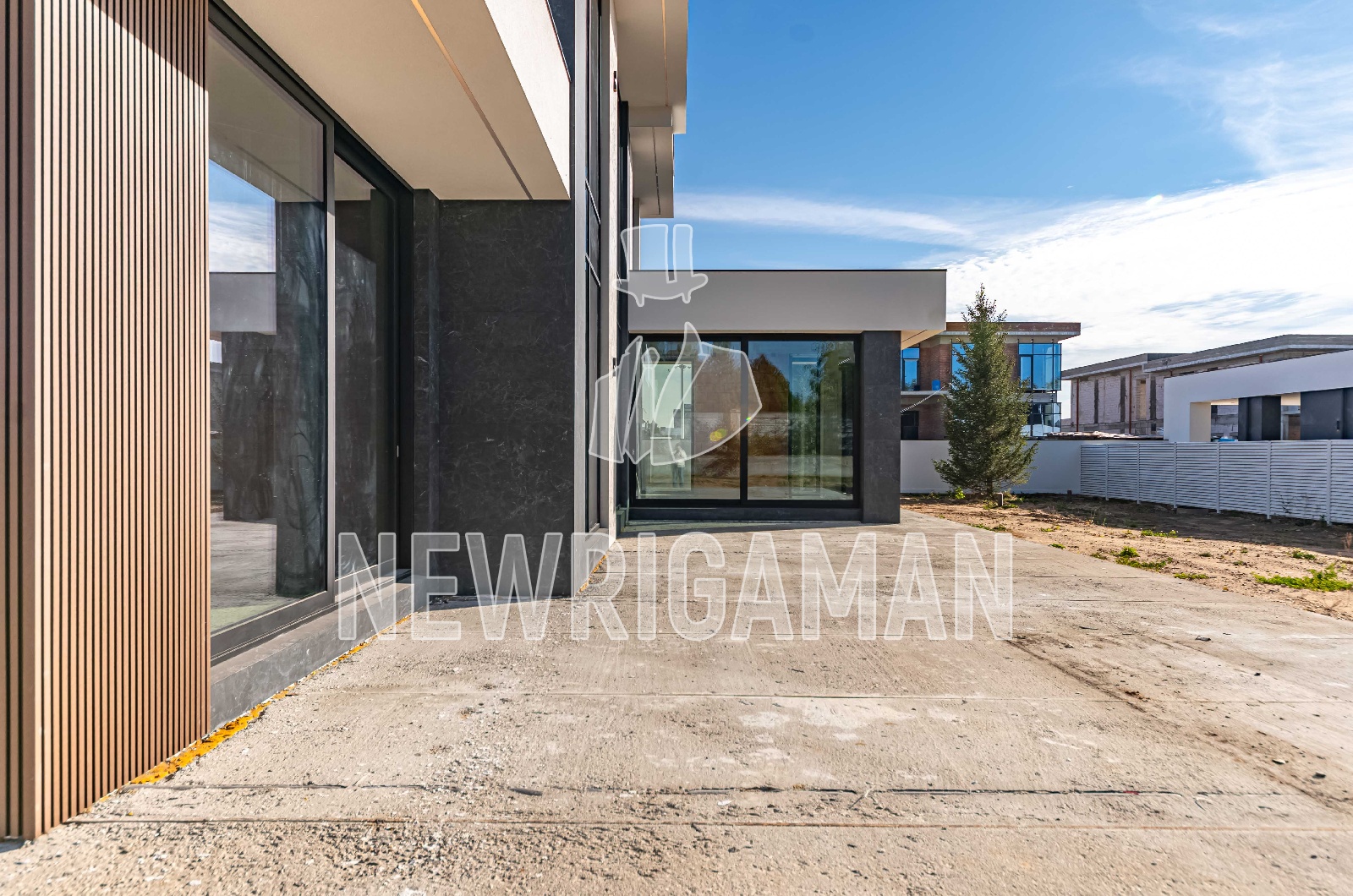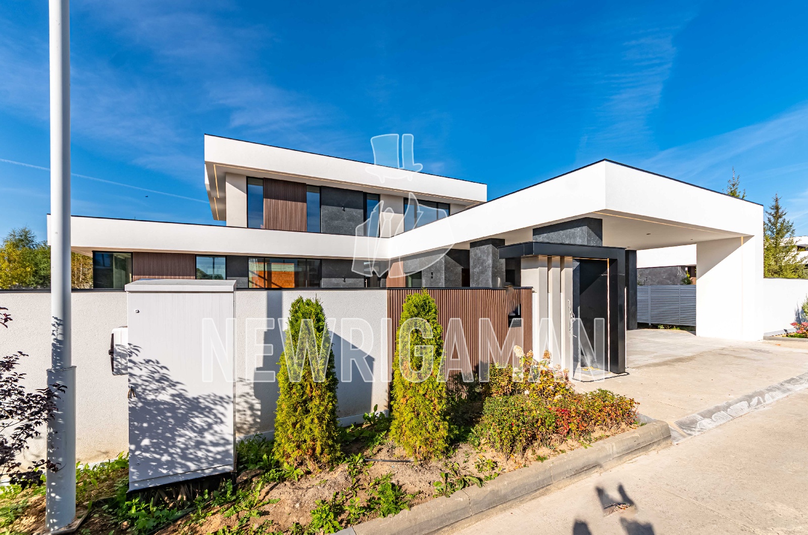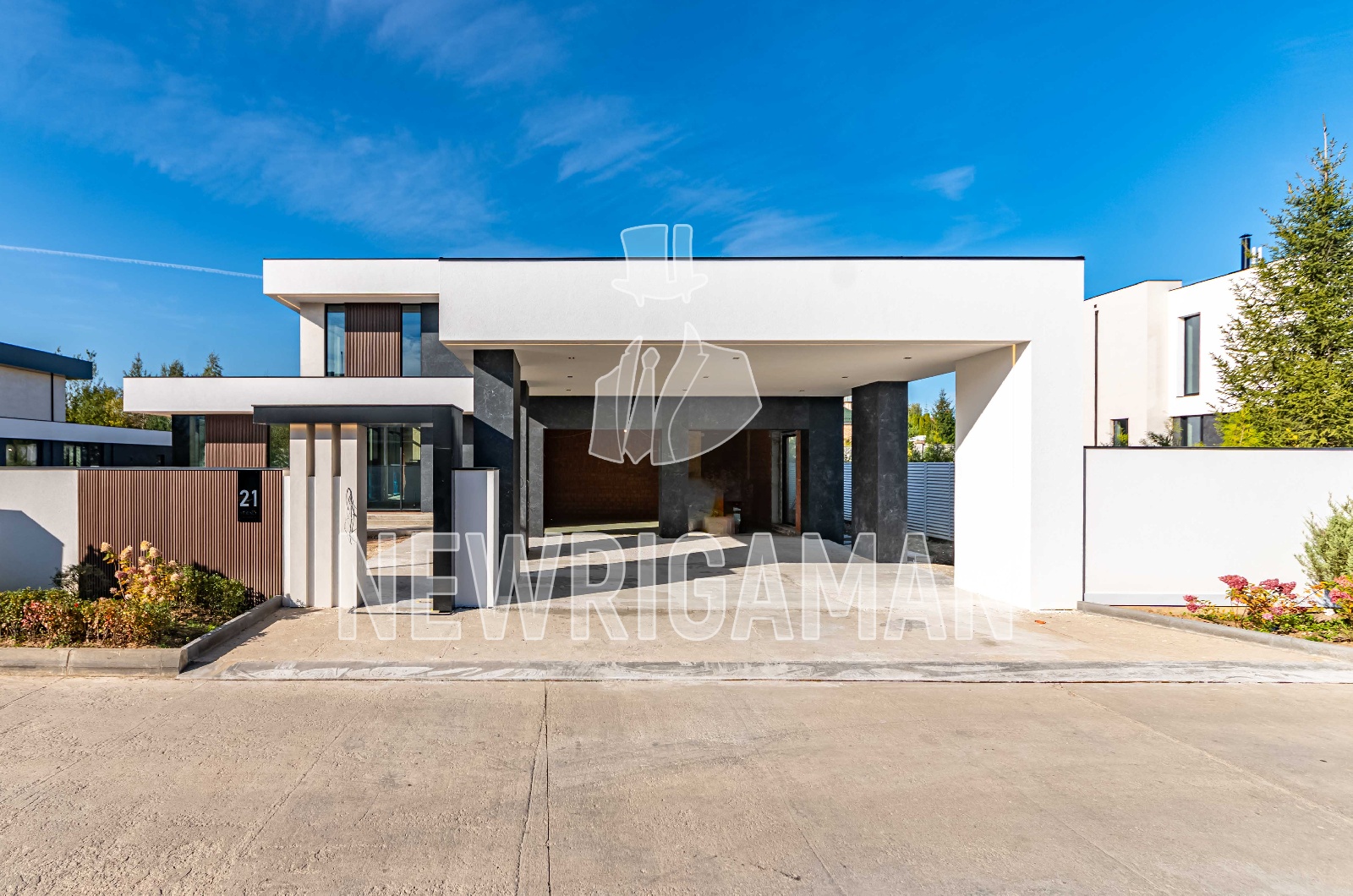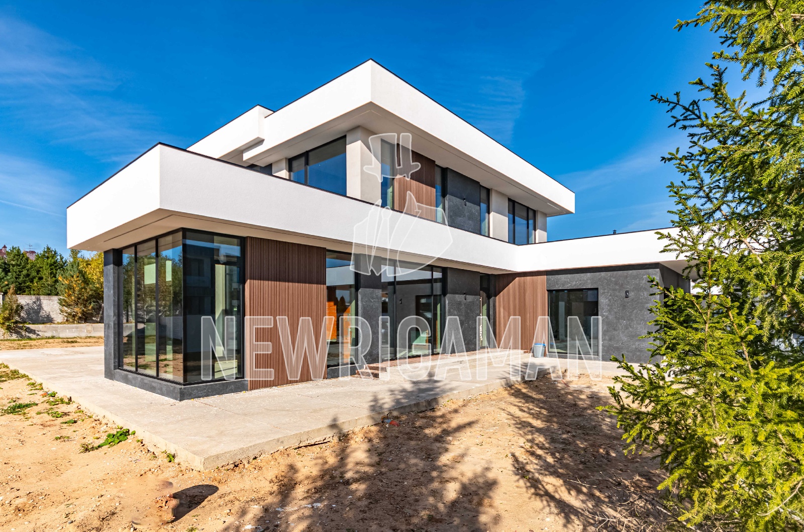 1 этаж - топочная, гардероб, кухня, столовая, гостиная, гостевая спальня с с/у и гардеробной, постирочная/комната для персонала, терраса, навес и гараж на 2 м/м каждый,