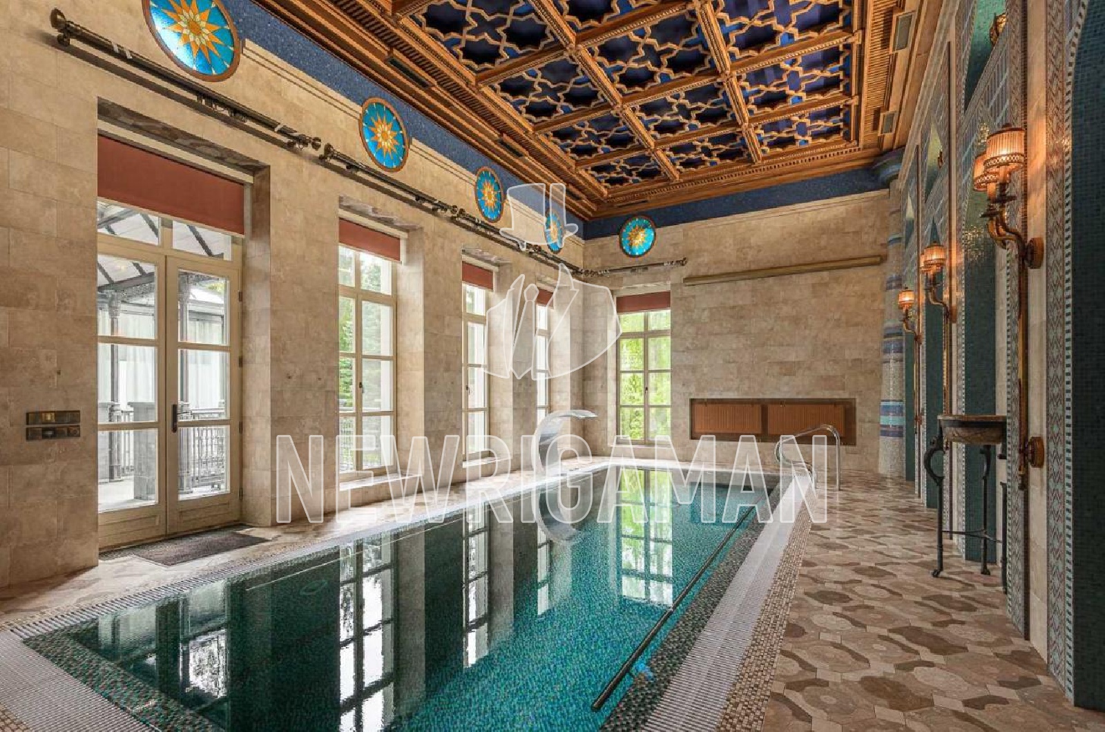 1 этаж - холл, лифт, гардеробная, с/у, сигарная с камином. гостиная с камином, кабинет, столовая с выходом на застекленную террасу, кухня парадная с лифтом, кладовая для персонала, спа-зона: бассейн 12м с противотоком, хамам, сауна, душевые, гараж на 2 м/м с с/у, блок персонала: кухня, с/у, 2 спальни, постирочная, комната охраны с с/у,