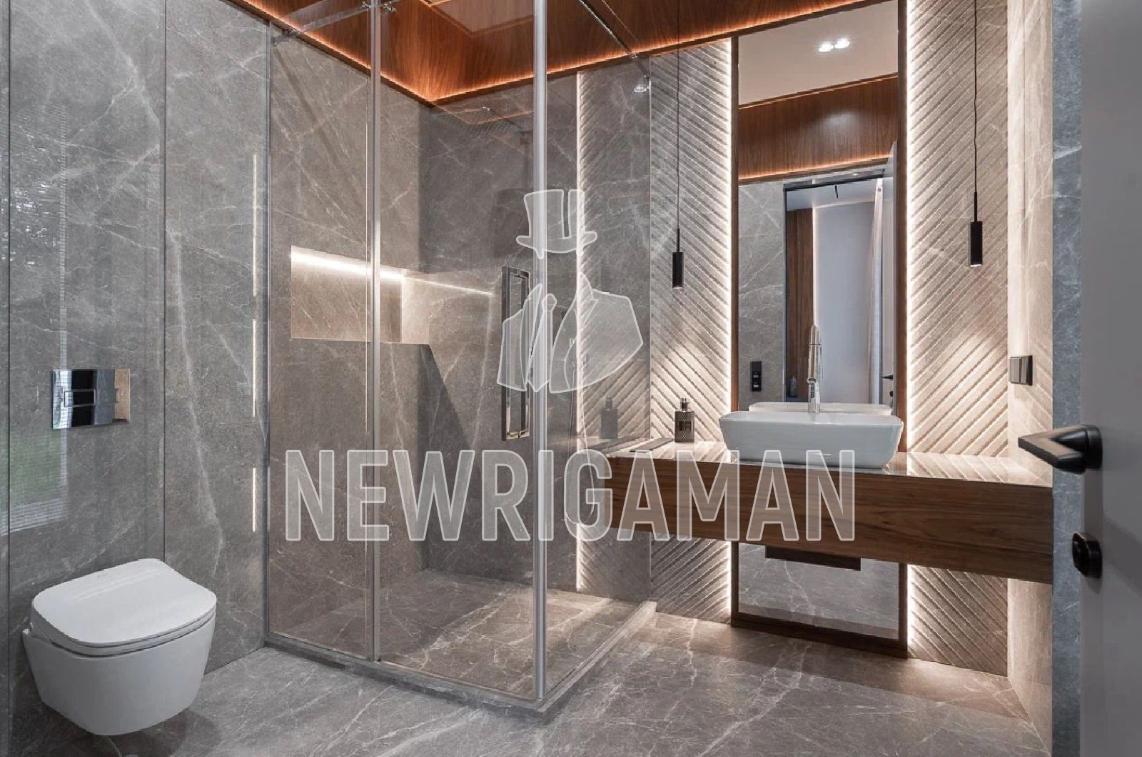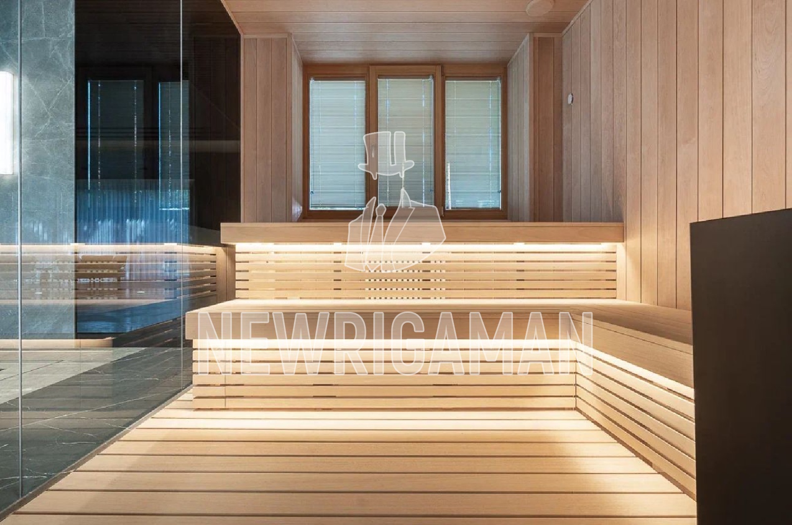 1 этаж - холл, гардеробная, 3 с/у, гостиная с камином, столовая с выходом на террасу, кухня, рабочая кухня, спальня с гардеробной и с/у, бассейн, сауна, душевая, гараж, котельная,