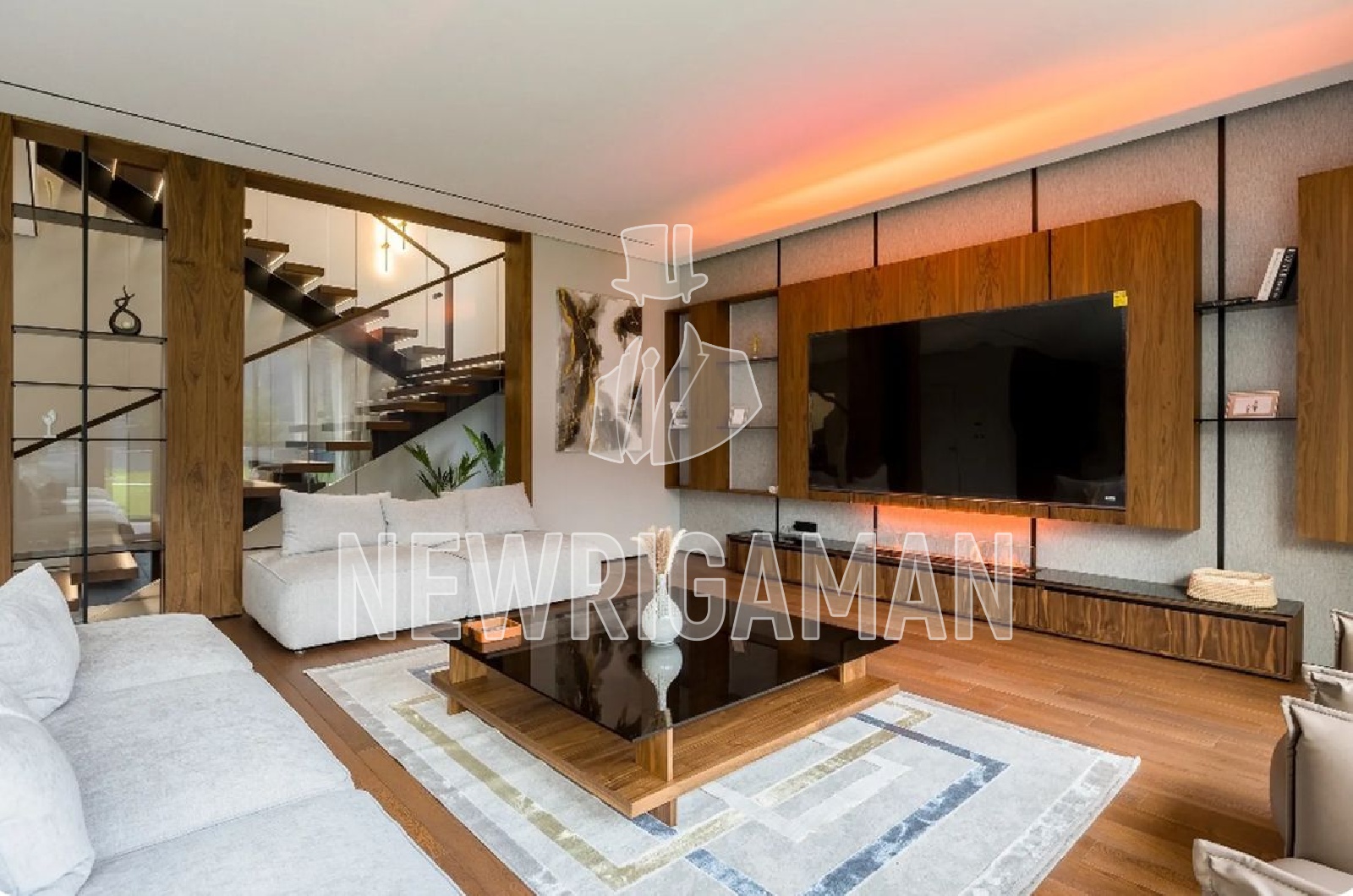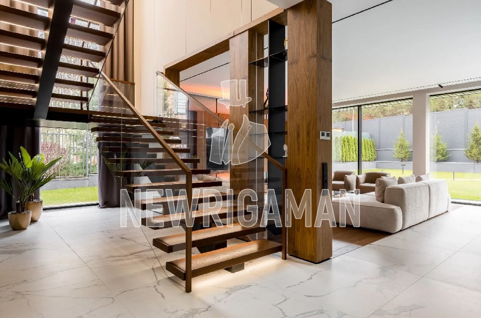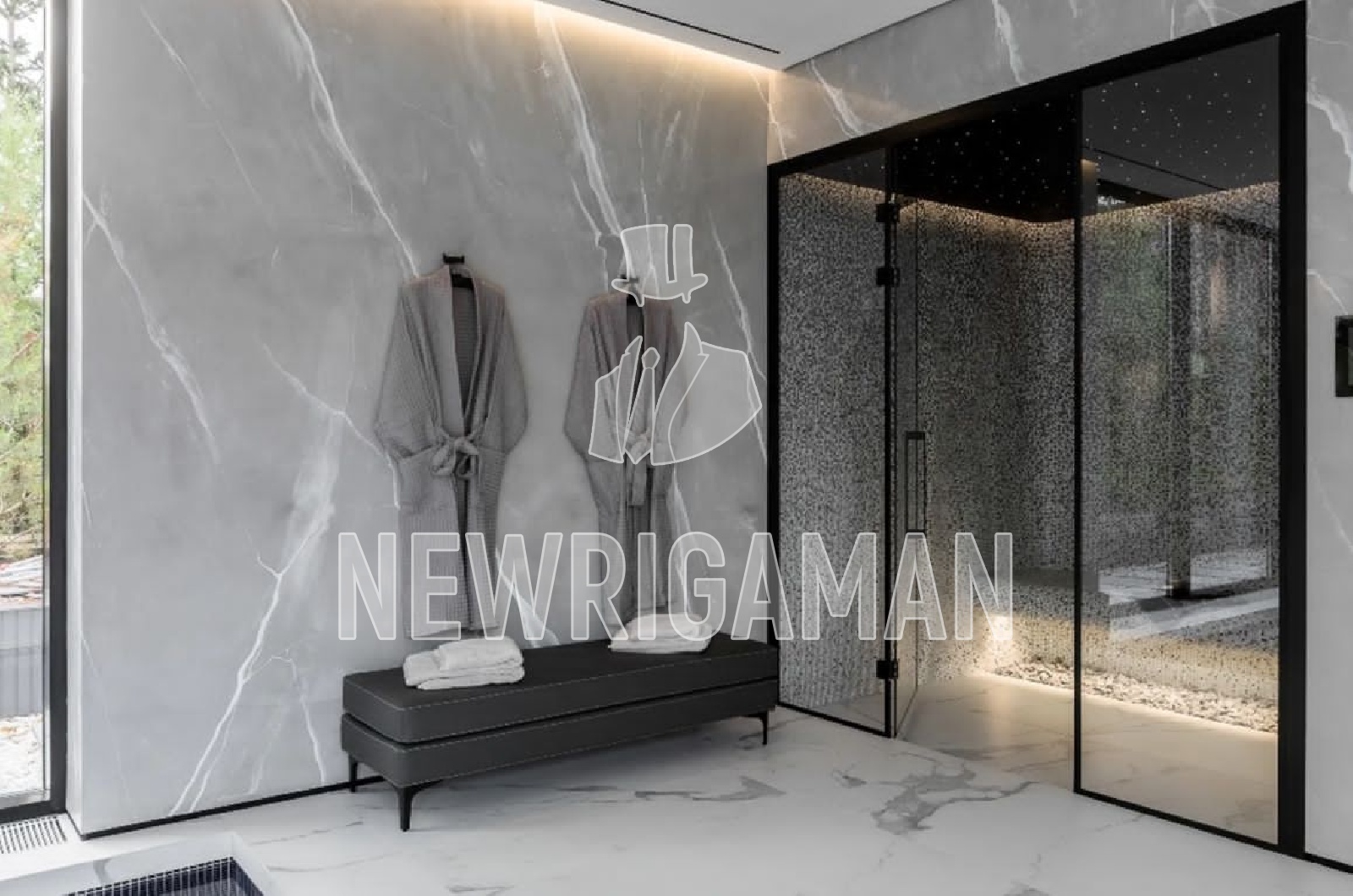 1 этаж - холл, гардеробная, с/у, постирочная, гостевая спальня с с/у, гостиная, кухня, кладовая, столовая с выходом на террасу, спа зона: хамам, с/у, бассейн, спортзал, гараж на 2 авто, квартира для персонала с отдельным входом,
