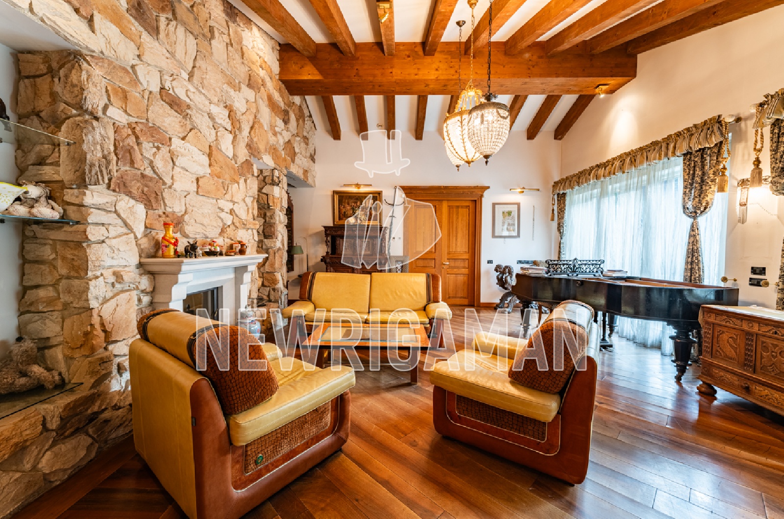 1 этаж - холл, гостиная с камином и выходом на террасу, кухня-столовая, кабинет, с/у, спальня с с/у,