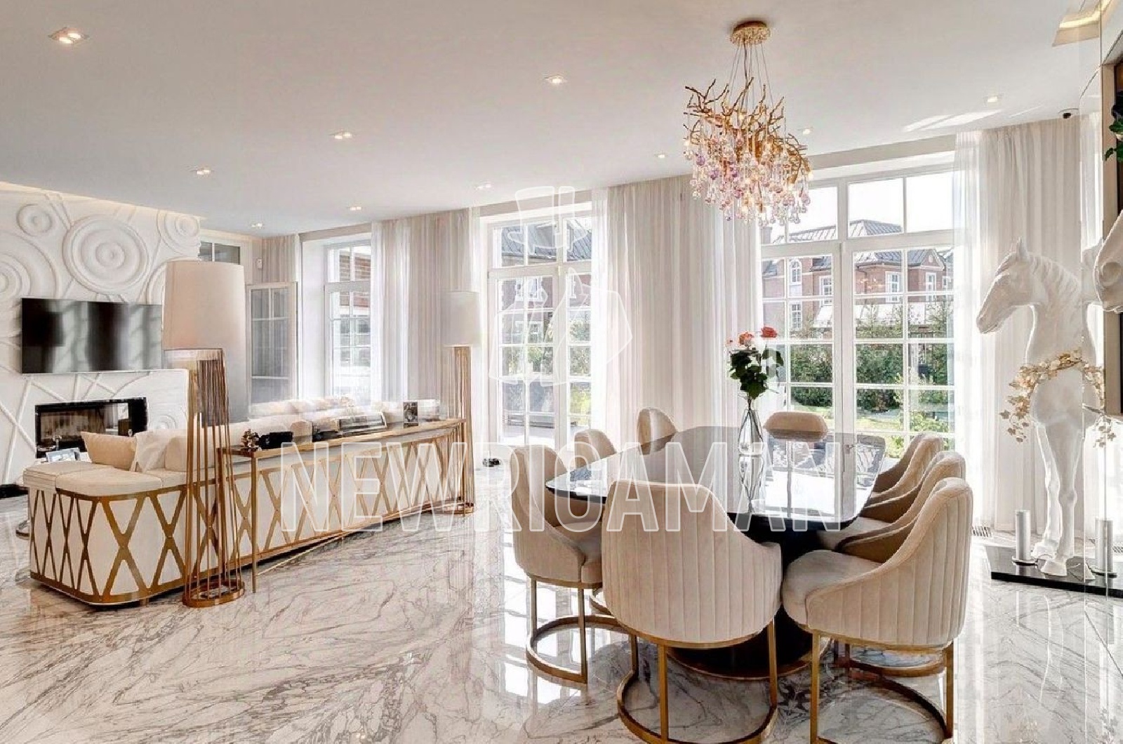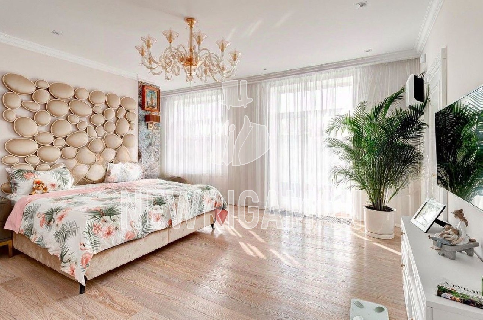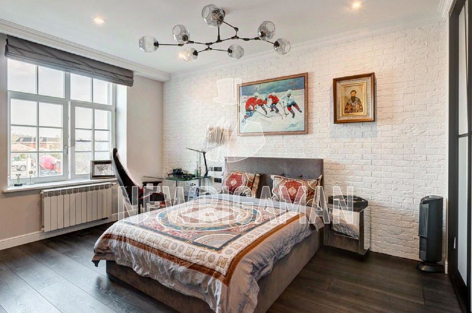 Продажа загородного дома площадью 560 кв.м. Коттеджный поселок Раздоры-2. Рублево-Успенское шоссе 5 км от МКАД. Дом построен в 2 этажа, под ключ. Фасад облицован красным клинкерным кирпичом и дополнен рустовкой, парадный вход украшают колонны. Интерьер резиденции выполнен по нестандартному дизайн-проекту в смешении стилей. В отделке преобладают светлые тона, зеркала и золочение. Санузлы облицованы керамогранитом под камень. На участке предусмотрены всё для полноценного отдыха и активного образа жизни. Здесь уютная летняя терраса, зона барбекю, где можно устраивать вечера с друзьями, а также площадка с уличными тренажерами — функциональное продолжение дома под открытым небом. Гараж: в контуре дома 2 м/м. Площадь участка 10 соток.