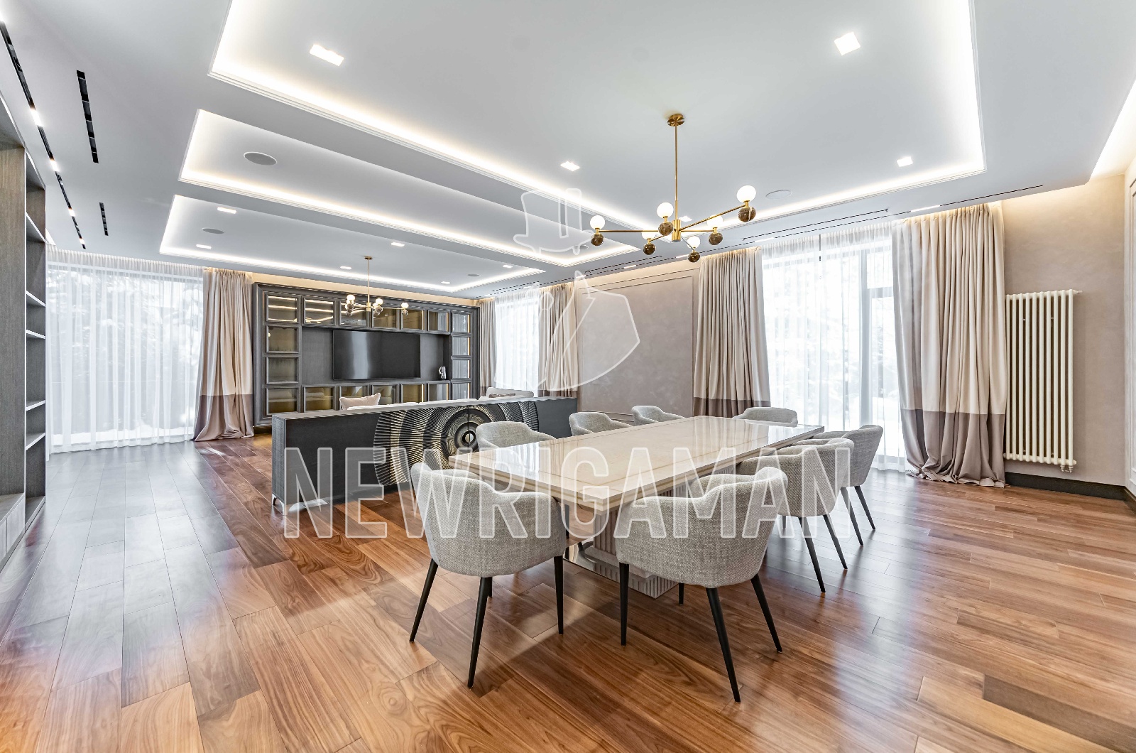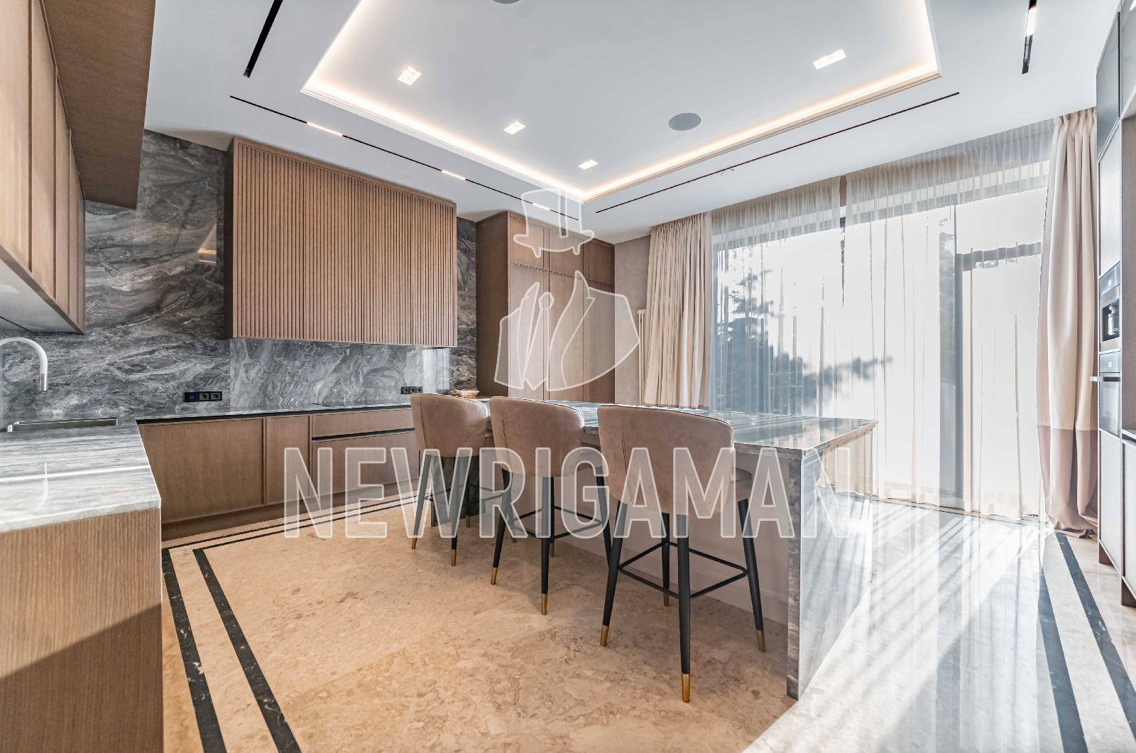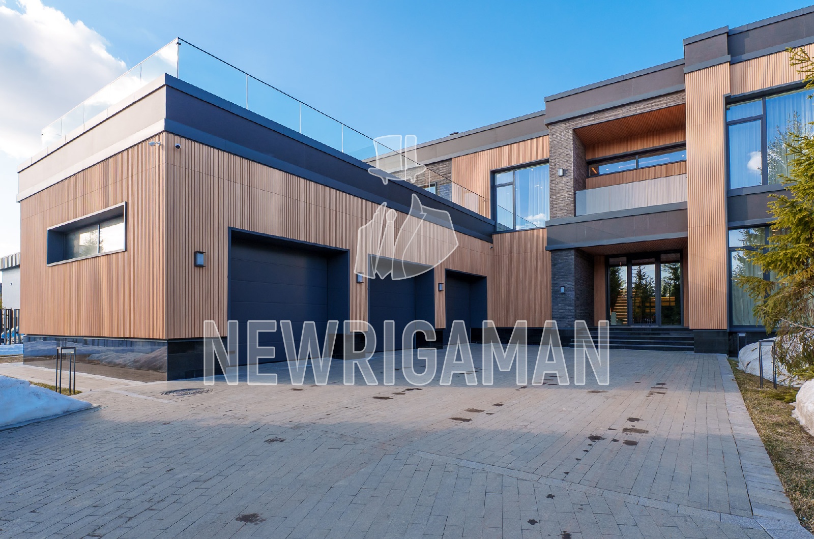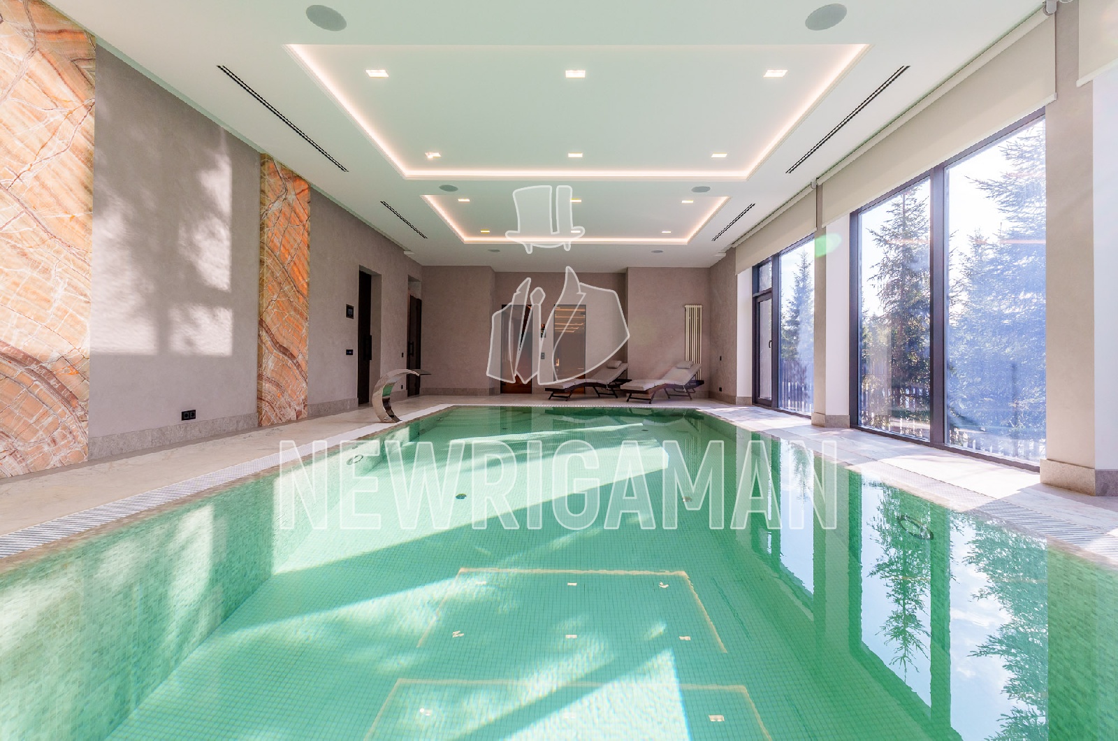 1 этаж - холл, гардеробная, гостиная-столовая с выходом на просторную террасу, кухня, рабочая кухня, гостевая спальня с с/у, кабинет, с/у, спа (бассейн, сауна, хамам, раздевалка, душевая, с/у), котельная, гараж на 3 м/м,