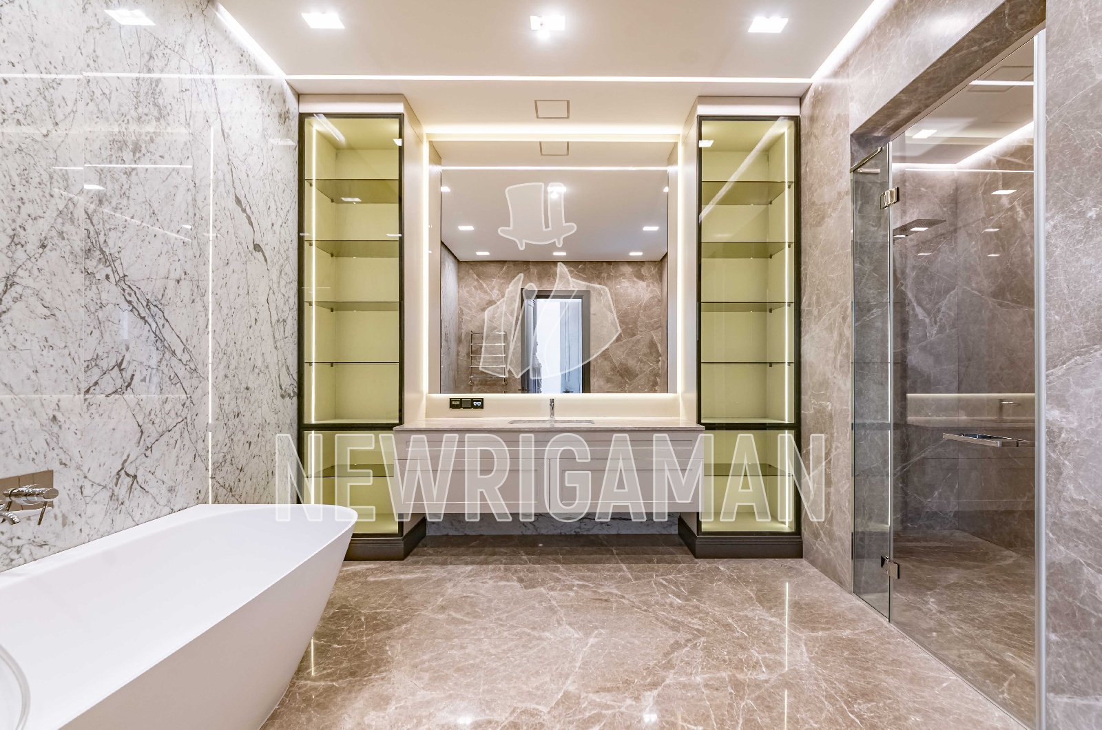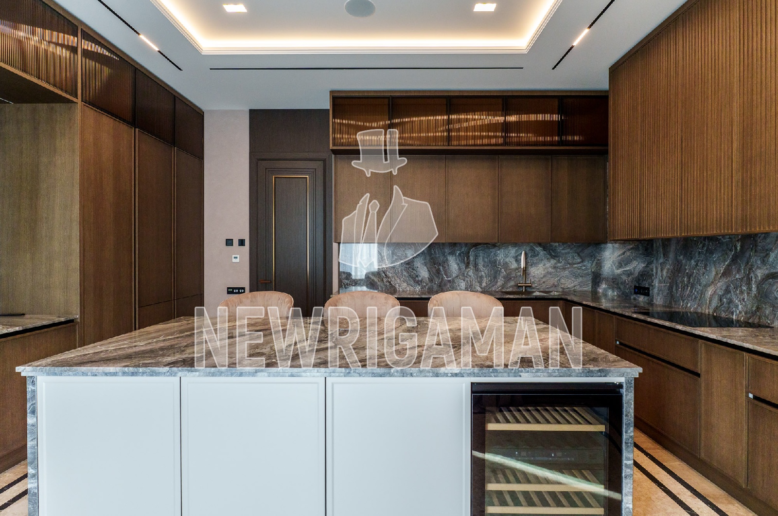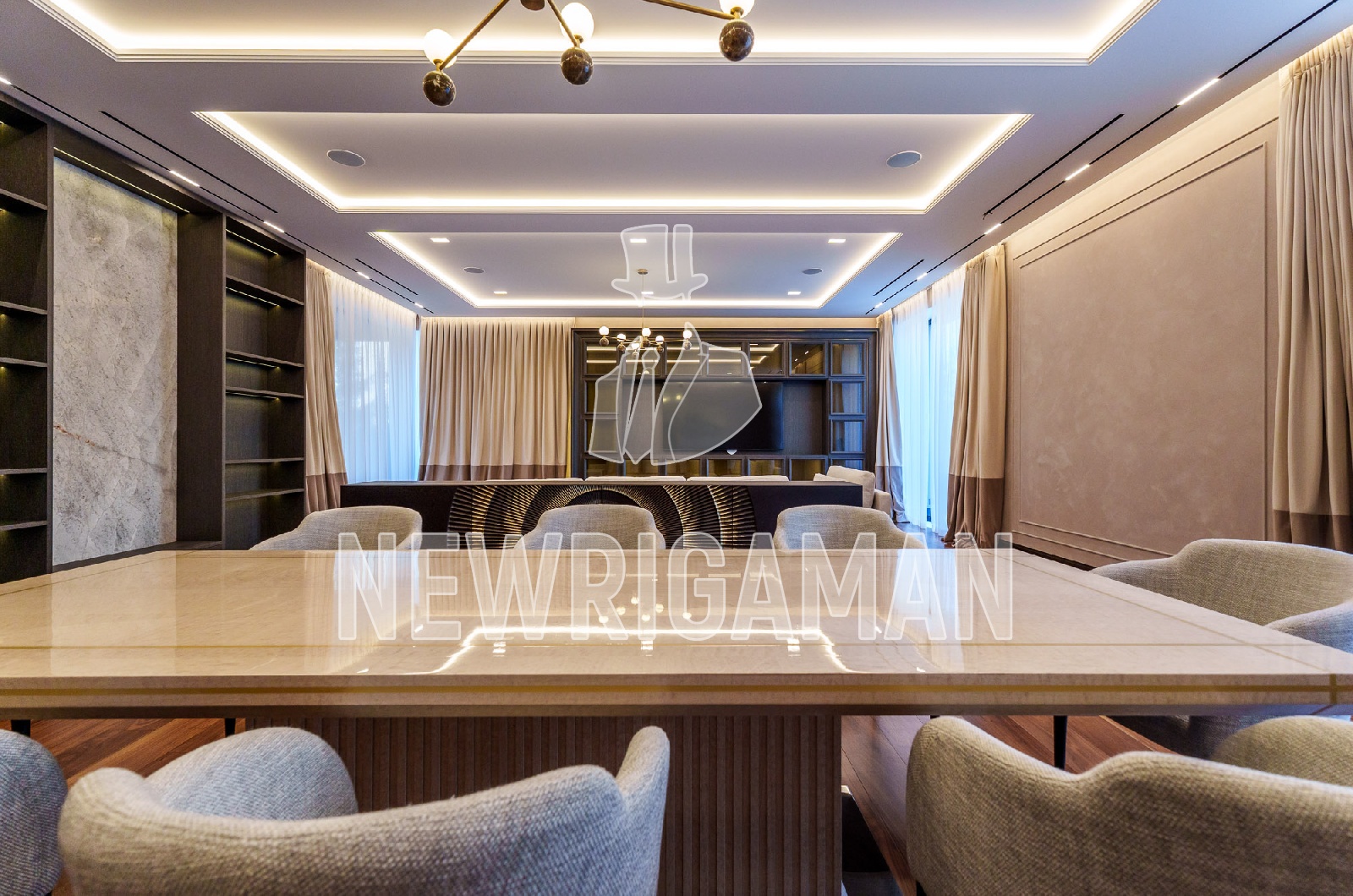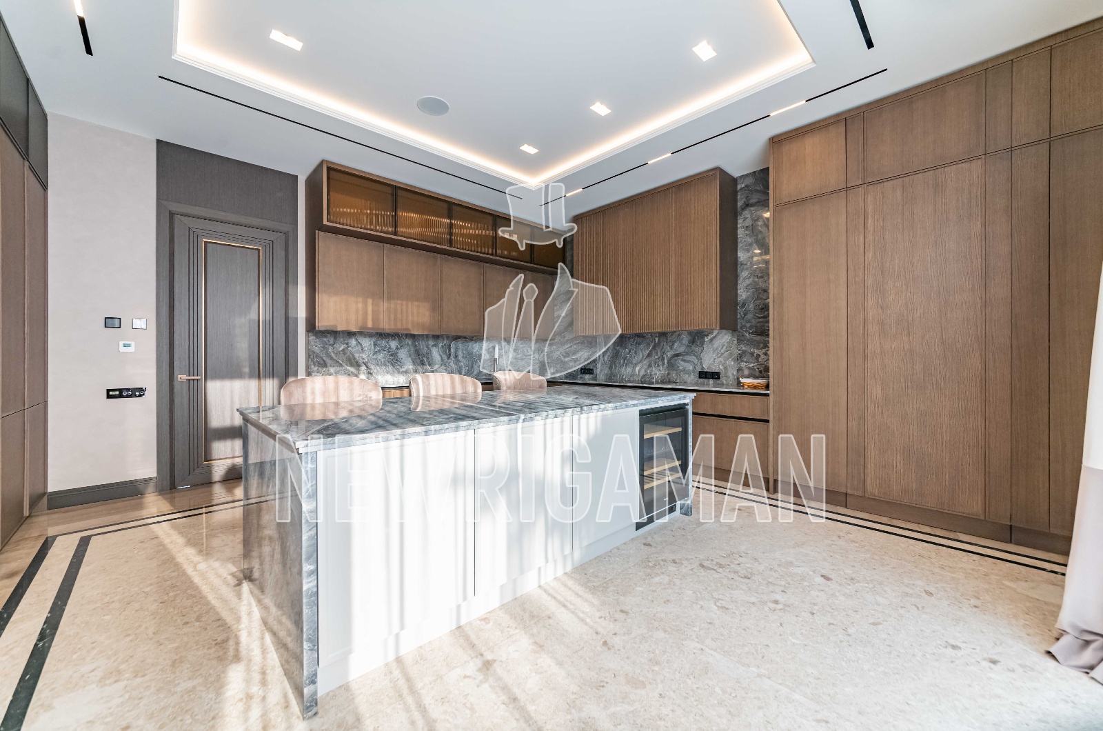 1 этаж - холл, гардеробная, гостиная-столовая с выходом на просторную террасу, кухня, рабочая кухня, гостевая спальня с с/у, кабинет, с/у, спа (бассейн, сауна, хамам, раздевалка, душевая, с/у), котельная, гараж на 3 м/м,