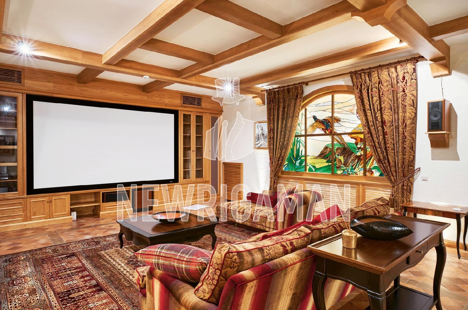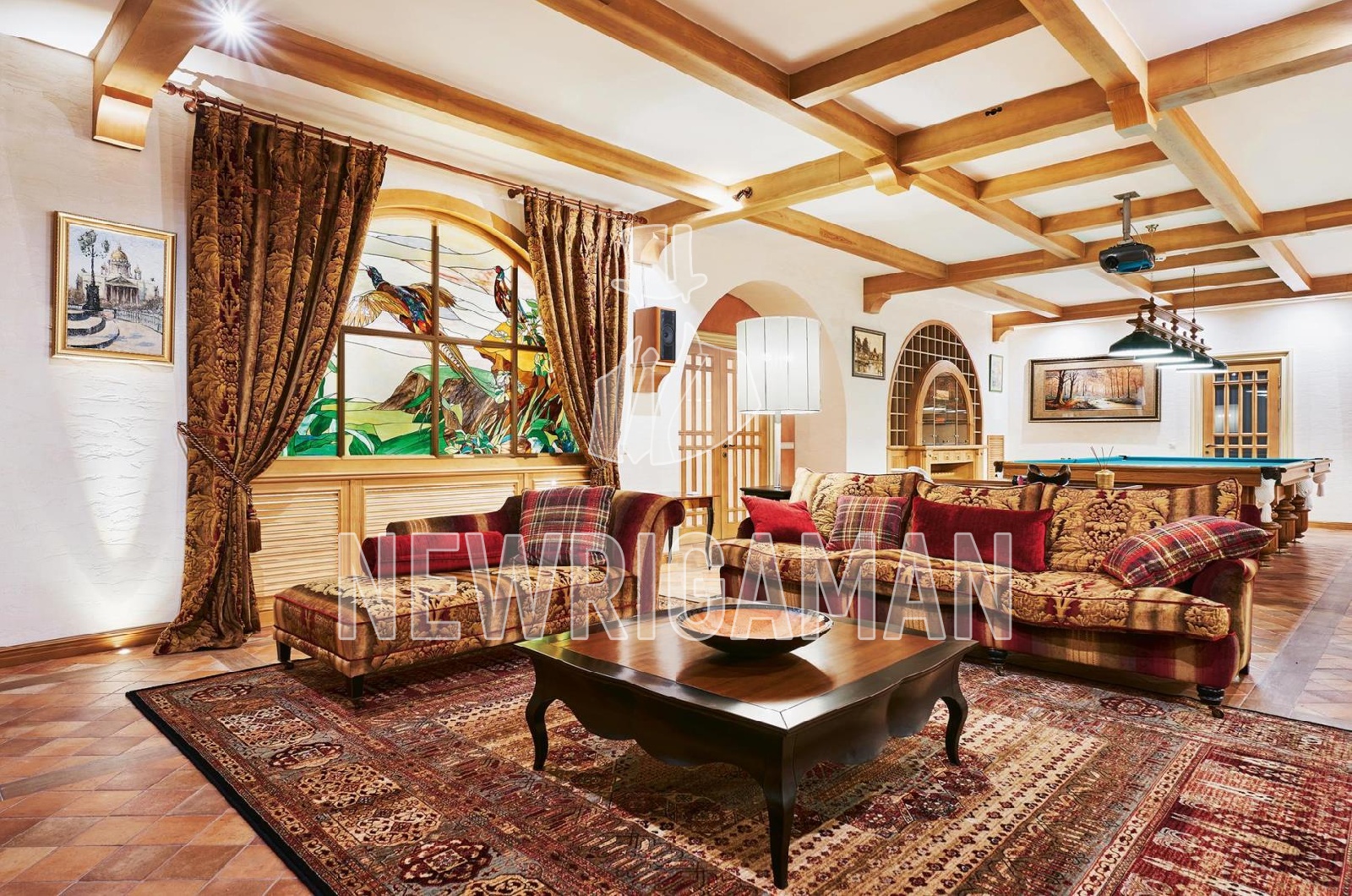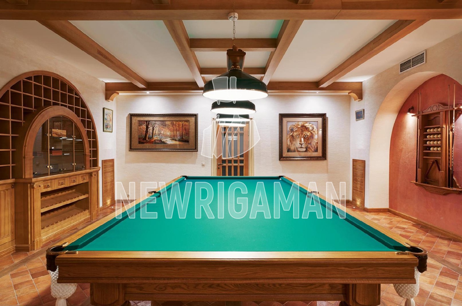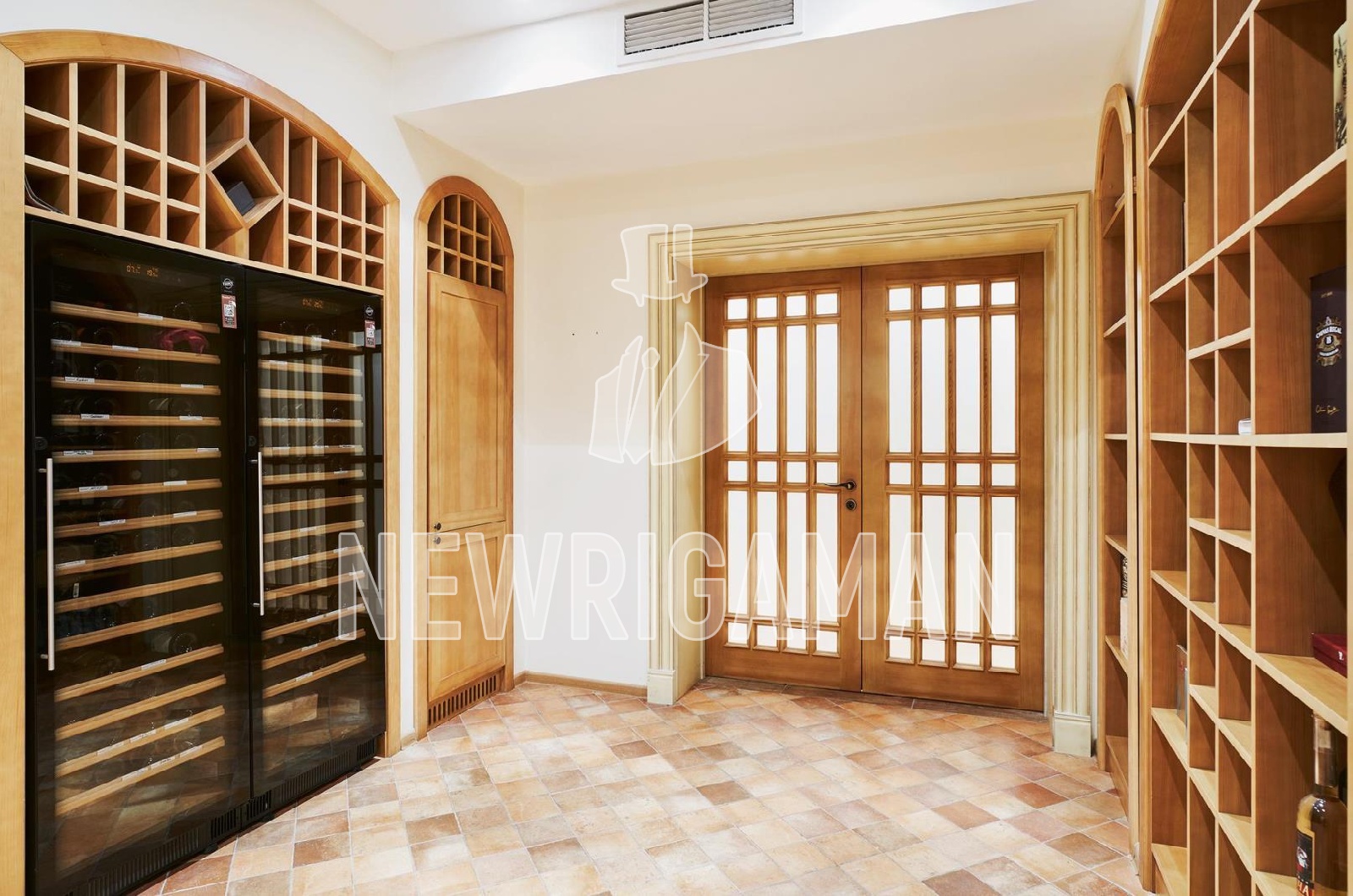 Цокольный этаж - холл, бильярдная и кинозал, с/у, 2 большие гардеробные для хранения сезонной одежды, холодильник для шуб, кладовая, постирочная, кладовая, винная комната, технические помещения.