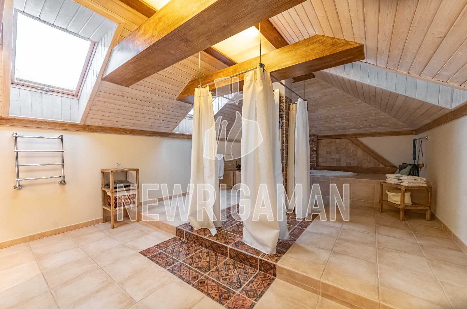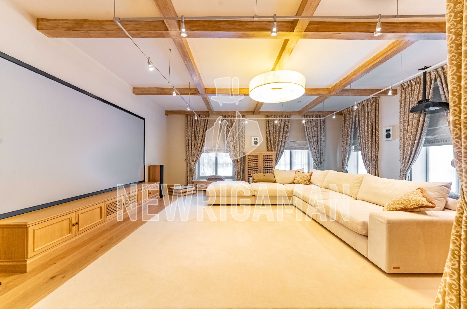 Цоколь - творческая мастерская, санузел, русская дровяная баня с купелью, душевая, комната отдыха, блок для персонала - спальня с санузлом, кухней с комнатой для хранения продуктов и техническим лифтом на 1 этаж, котельная с выходом на улицу, постирочная,