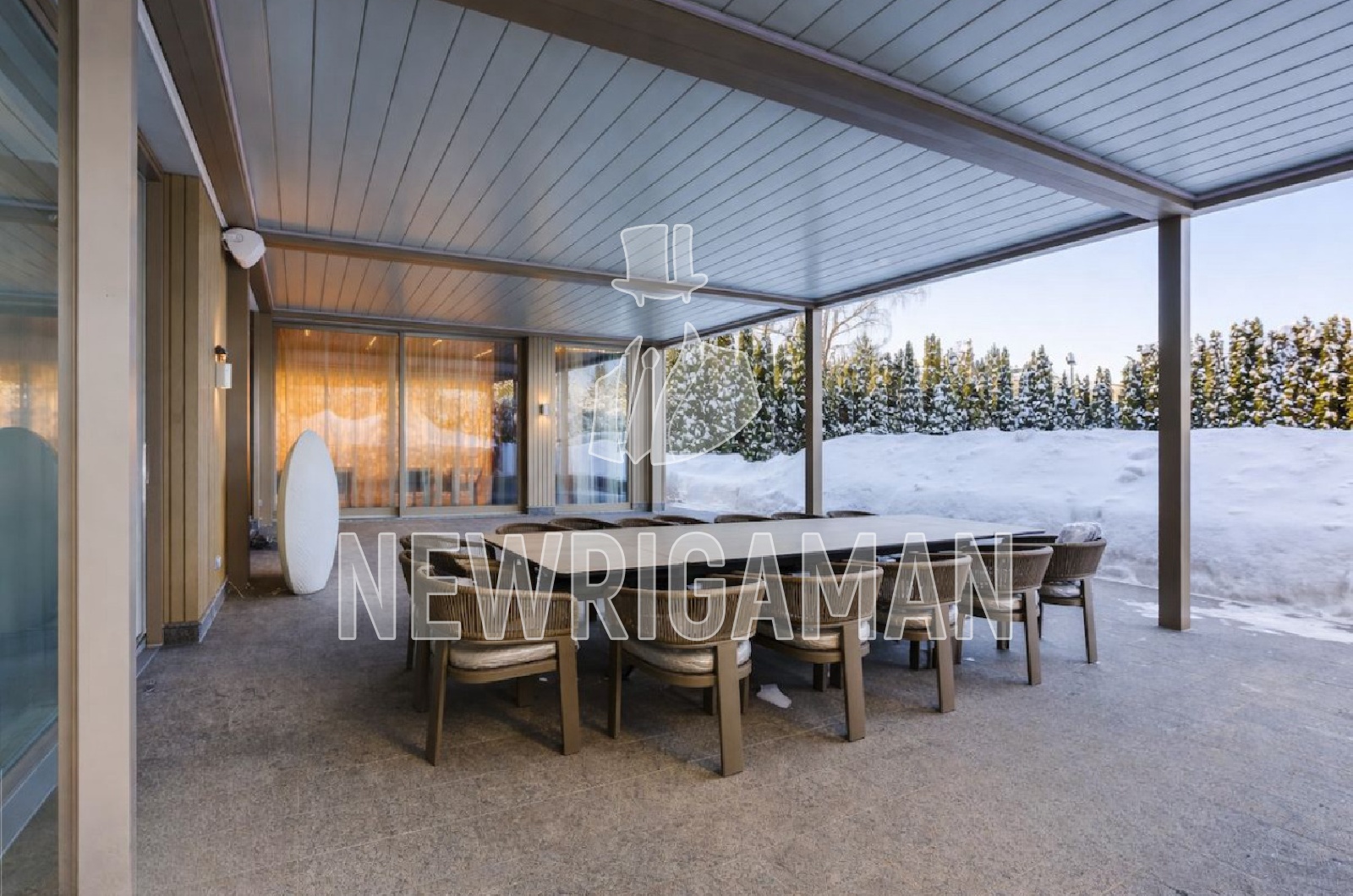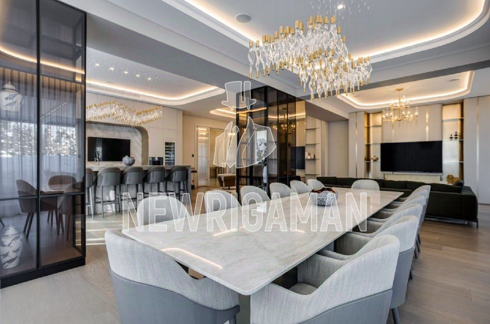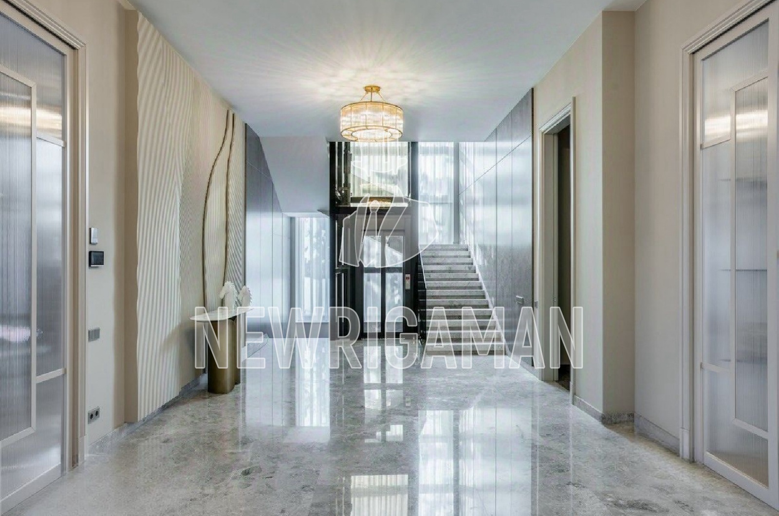 1 этаж - прихожая, гардеробная, холл, лифт, гостевая спальня с гардеробной и с/у, гостиная, столовая, 2 кухни, гостевой с/у, бассейн, сауна, с/у, душевая, серверная, гараж, лифт,