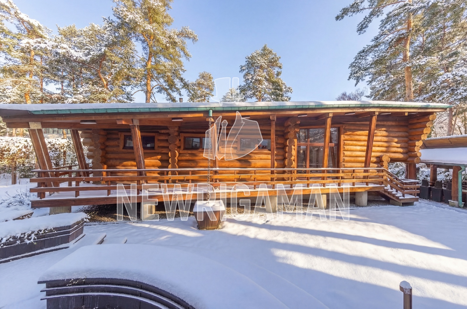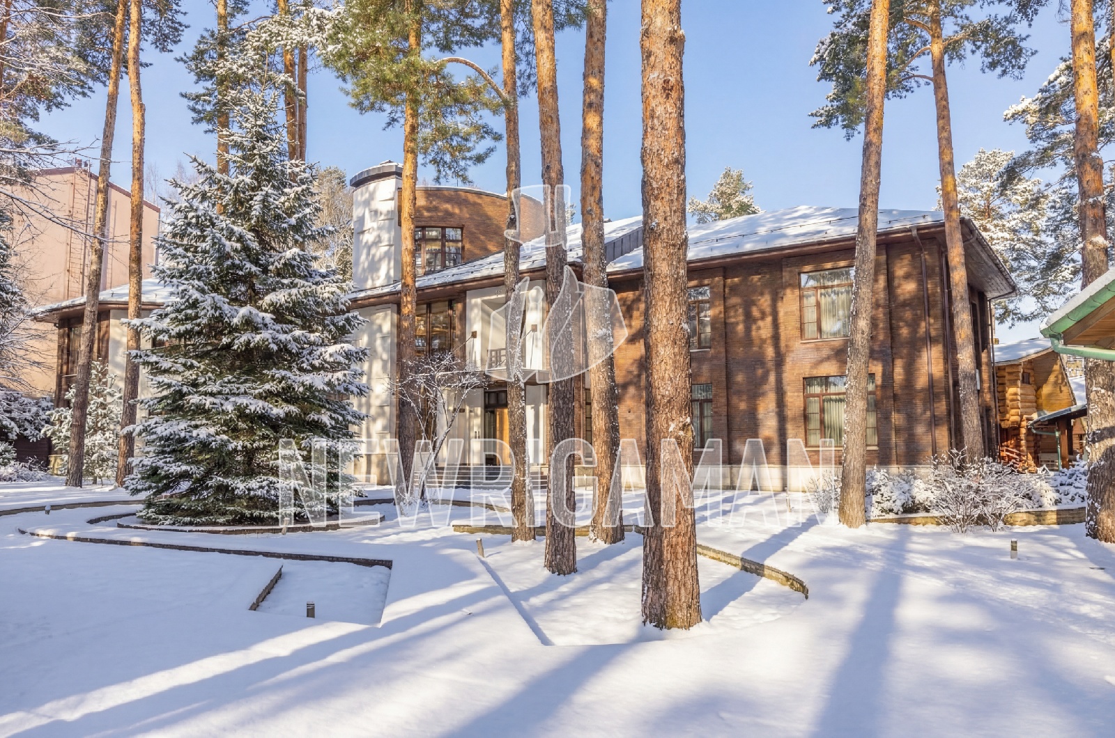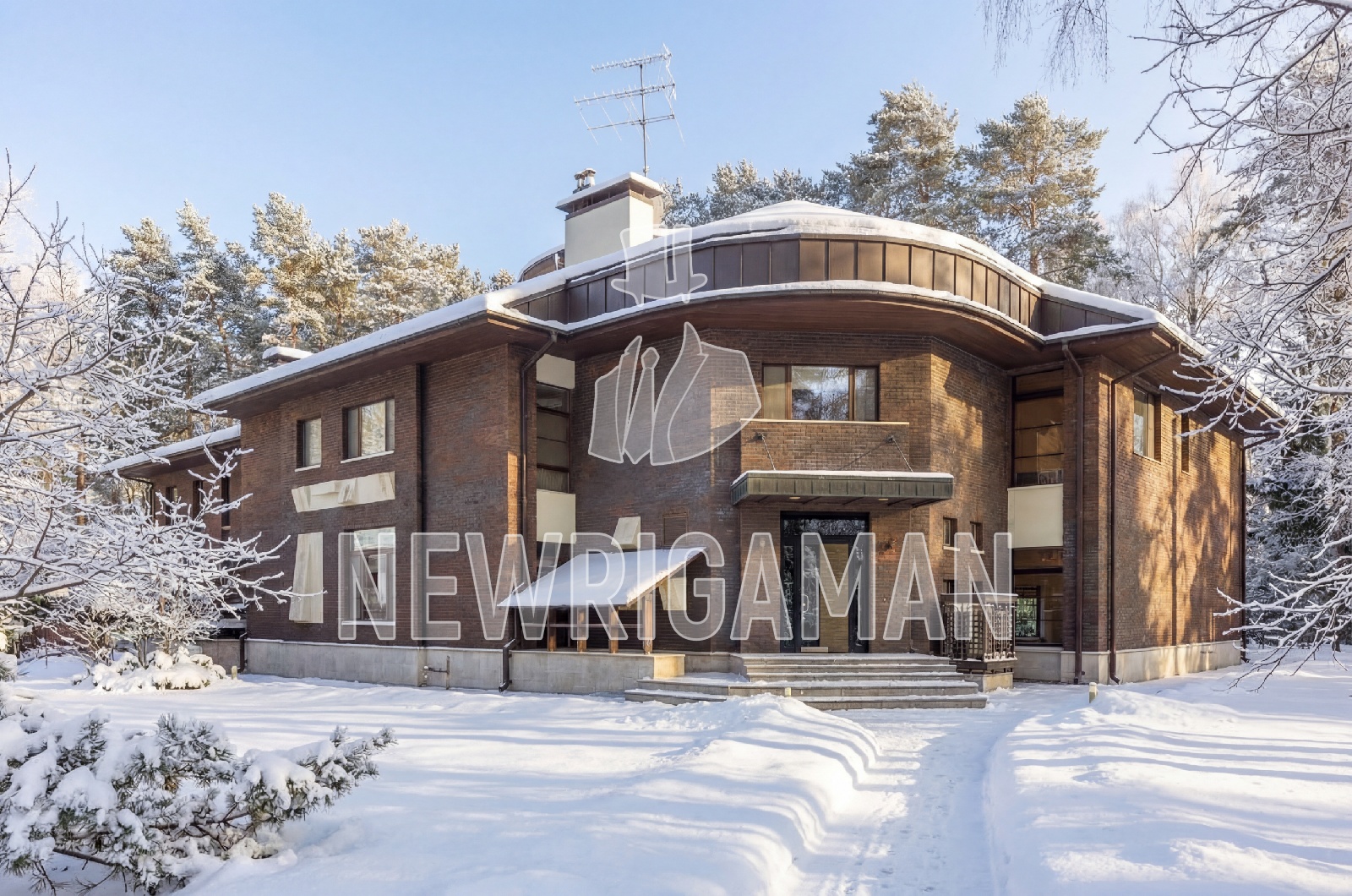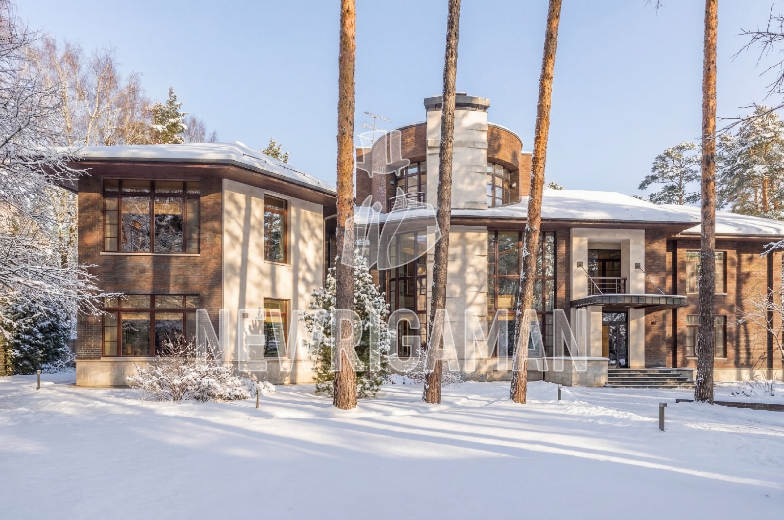 Продажа загородного дома площадью 1077 кв. м. Сколковское шоссе, 2 км от МКАД. Коттеджный поселок Сколково. Дом построен в 3 этажа под ключ. Фасады здания выполнены архитектурным бюро Николая Голованова и Дмитрия Величкина в стилистике известнейшего американского архитектора Фрэнка Ллойда Райта, облицованы дорогостоящим немецким клинкерным кирпичом и кварцитом. Вся кровельная фурнитура всех построек на участке выполнена из меди. Подшивки карнизов – дерево. Окна с тройным остеклением, отсечением излишних УФ лучей и шумоизоляцией, в деревянных рамах. У дома имеются просторные балконы. Интерьеры выдержаны в стиле Ар-деко с современными элементами. В отделке использованы только высококлассные дорогостоящие материалы и оборудование. Паркет – из массива американского ореха и дуба. Настенные деревянные панели из массива карельской березы, ореха, махагона, и др. Панно из полудрагоценных камней: агат, содалит, оникс. Пол в холле выполнен из мрамора Portoro Nero – одного из самых редких и дорогих видов мрамора, добываемого под толщей вод Средиземного моря в Италии. В доме собрана коллекция картин, арт объектов, художественной керамики. Баня из цельного сибирского кедрового бруса с печью Mironoff мелко дисперсного пара, двумя зонами отдыха, купелью и столом для мыльного массажа – это изюминка данного домовладения! Выполнено благоустройство, разбит сад и дорожки, осуществлены уличные подсветки. Подведены все коммуникации. На участке разбита беседка, имеется терраса из кухни. Завершается строительство крытой беседки с барбекю. На участке оборудован гараж на две машины с комнатой охраны и апартаменты для обслуживающего персонала. Площадь участка 45 соток.