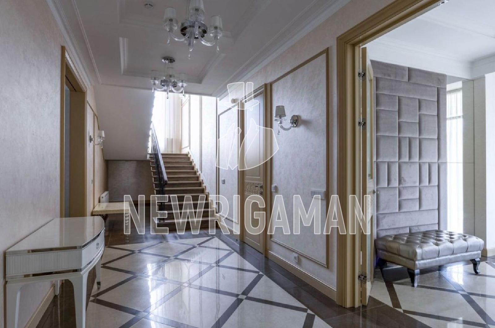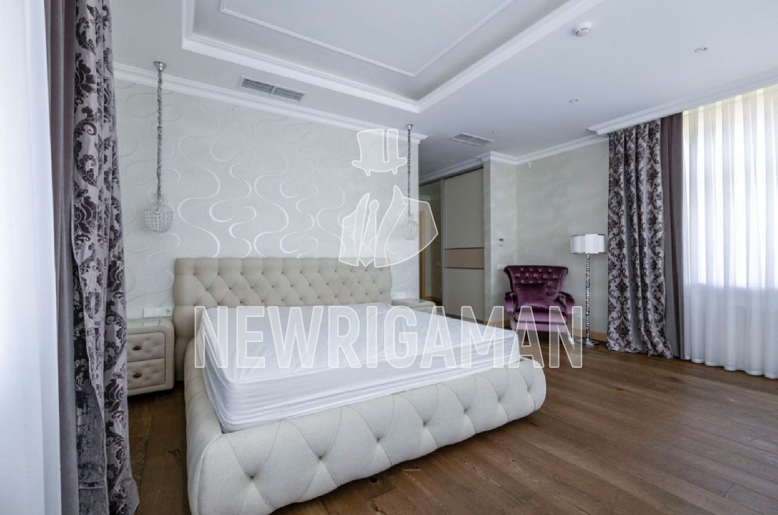 2 этаж - холл, основная спальня с ванной комнатой и сауной, три спальни, два санузла, домашняя прачечная.